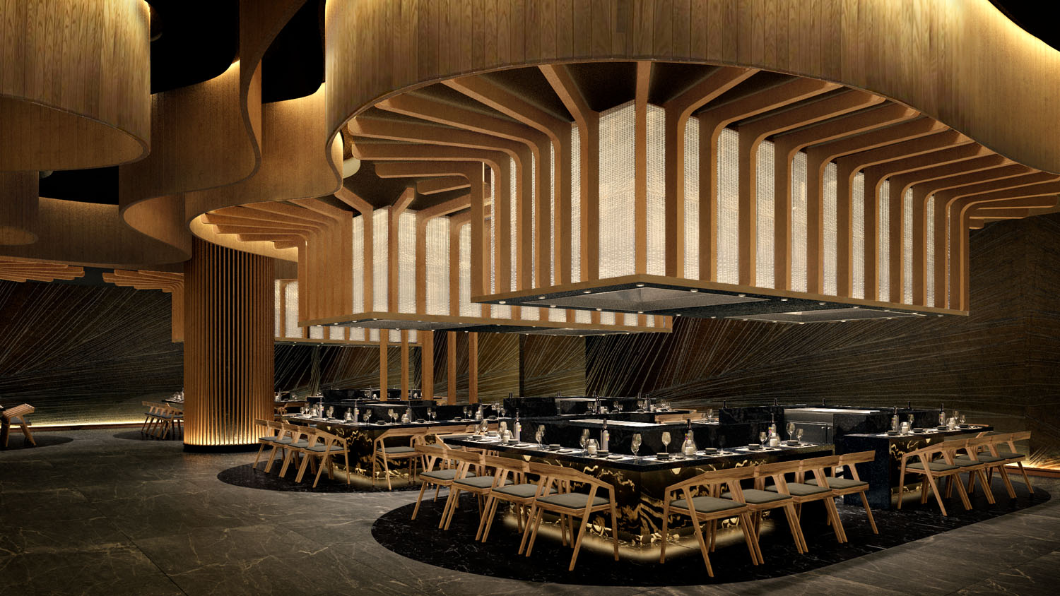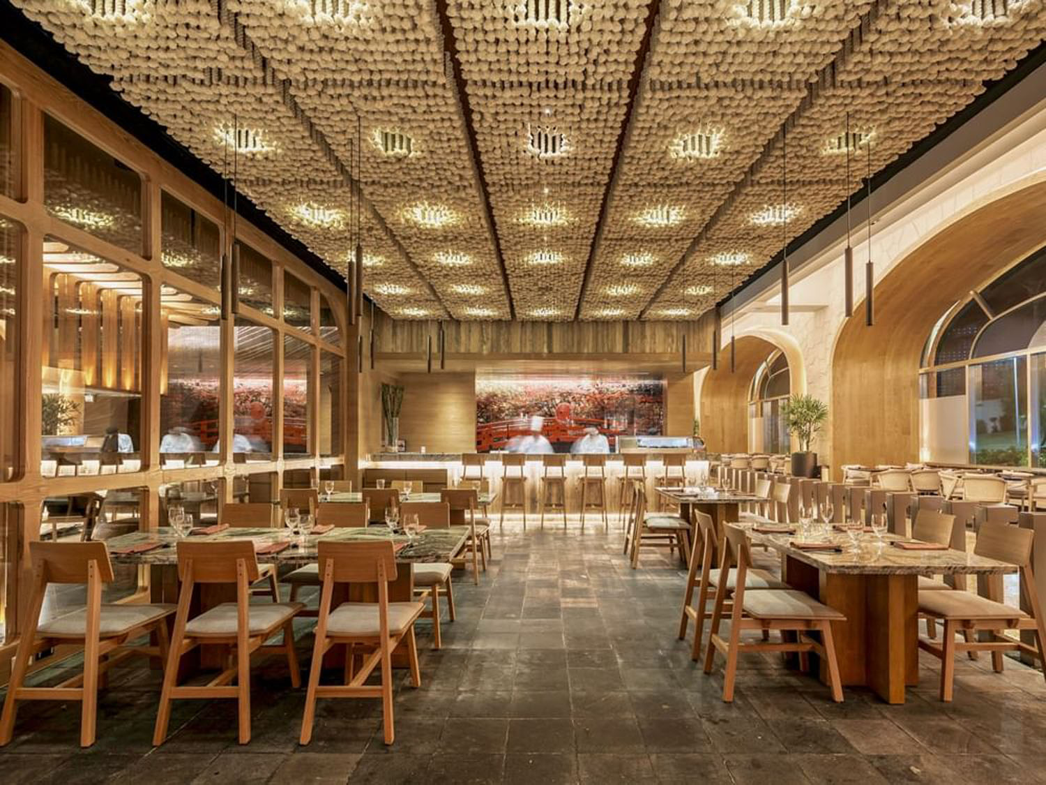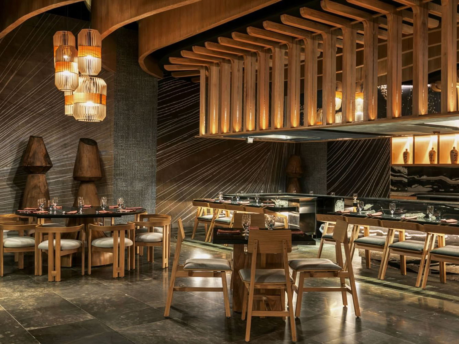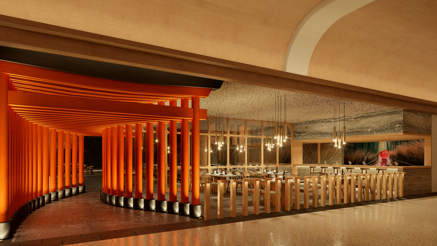 La puerta al santuario gastronómico enmarcado por la interpretación del Torii japonés al interior del hotel Gran Fiesta Americana Coral Beach, es la bienvenida a un espacio dual con ambientes metamorfos, la cocina abierta es el espacio ideal para invitar a disfrutar del omakase exclusivo del Chef, mientras que la terraza se vuelve un espacio diáfano y versátil.
