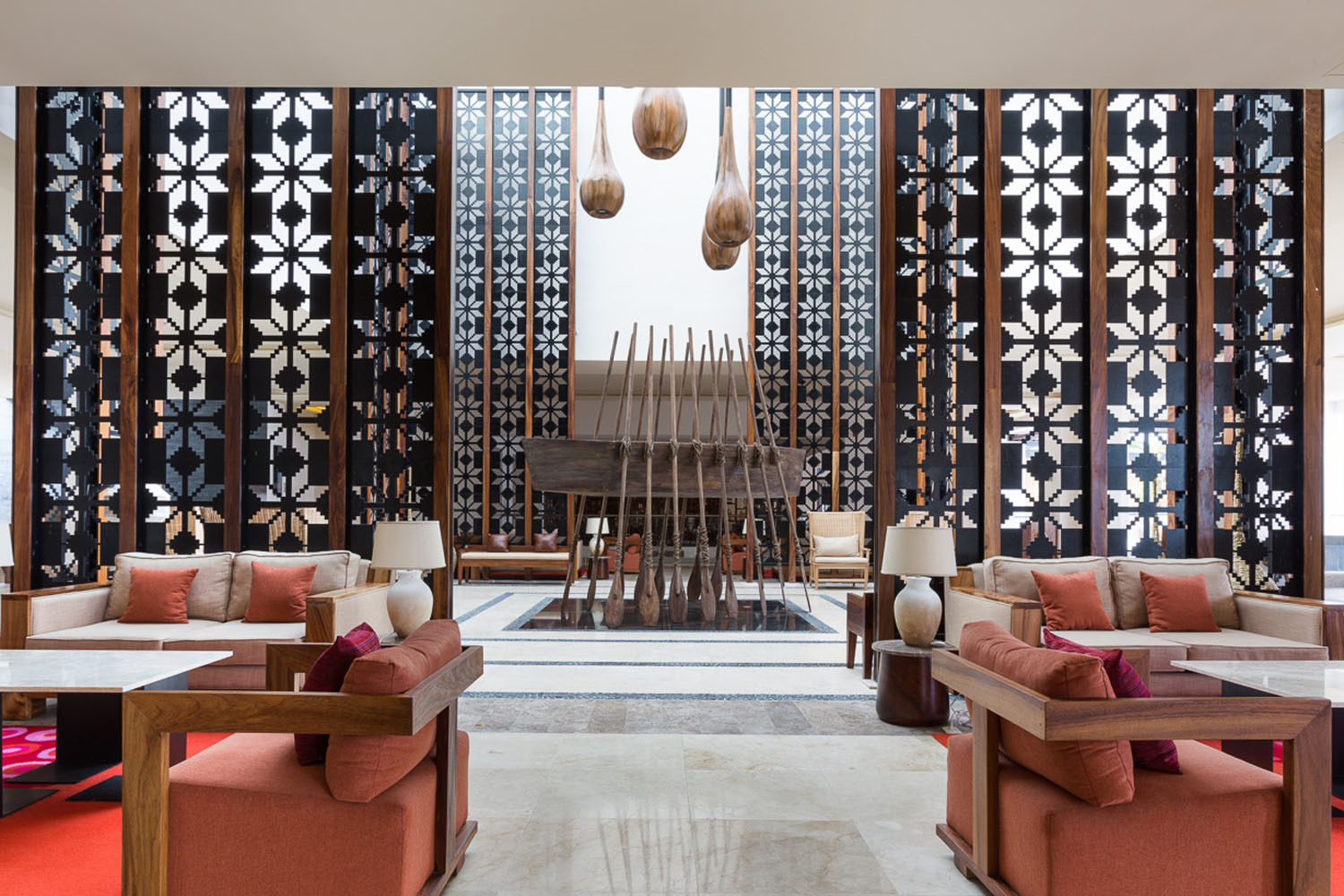 Elementos clásicos de las historias contadas por los nativos de la región convertidos en piezas de arte, se enmarcan en una postal que perdura en el tiempo dentro de un espacio de triple altura que connota un diseño conservador con referente histórico, autónomo y sin precedentes.