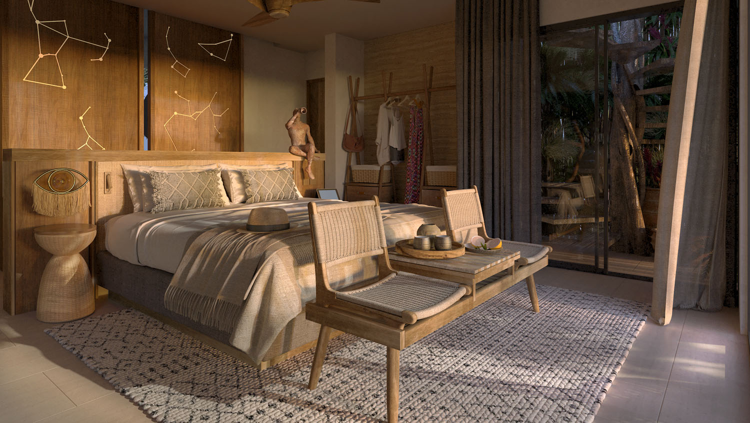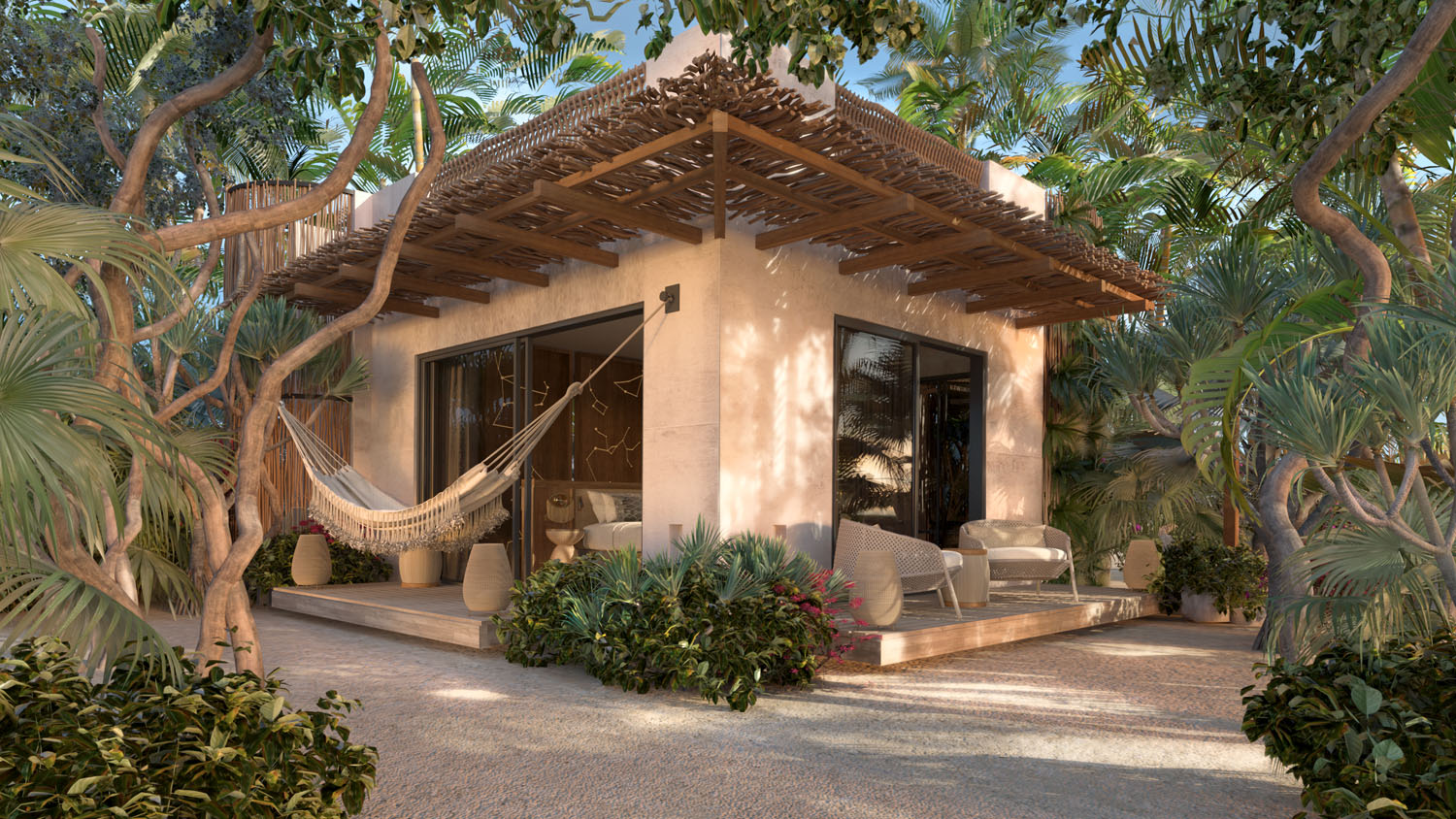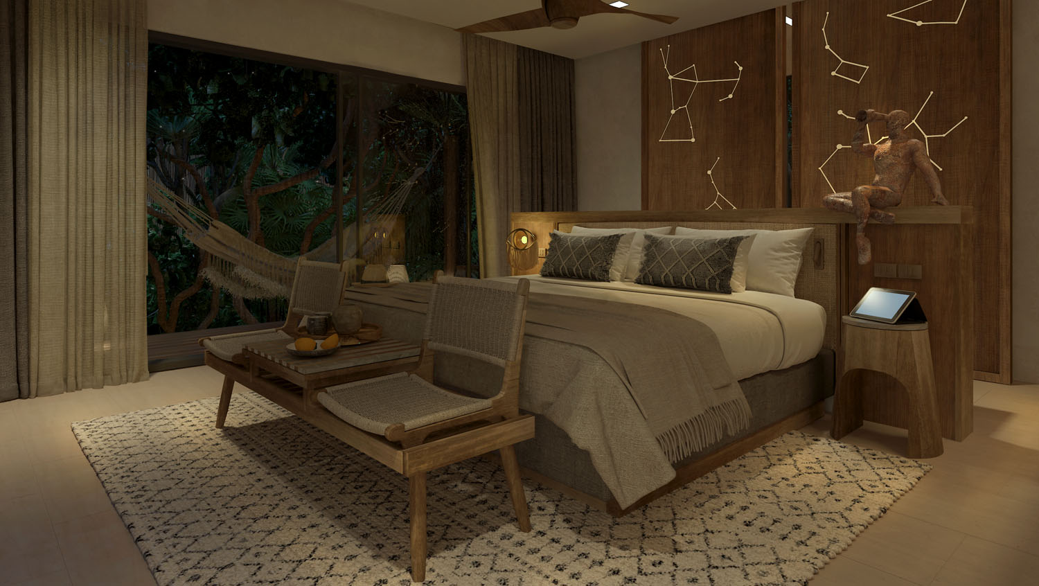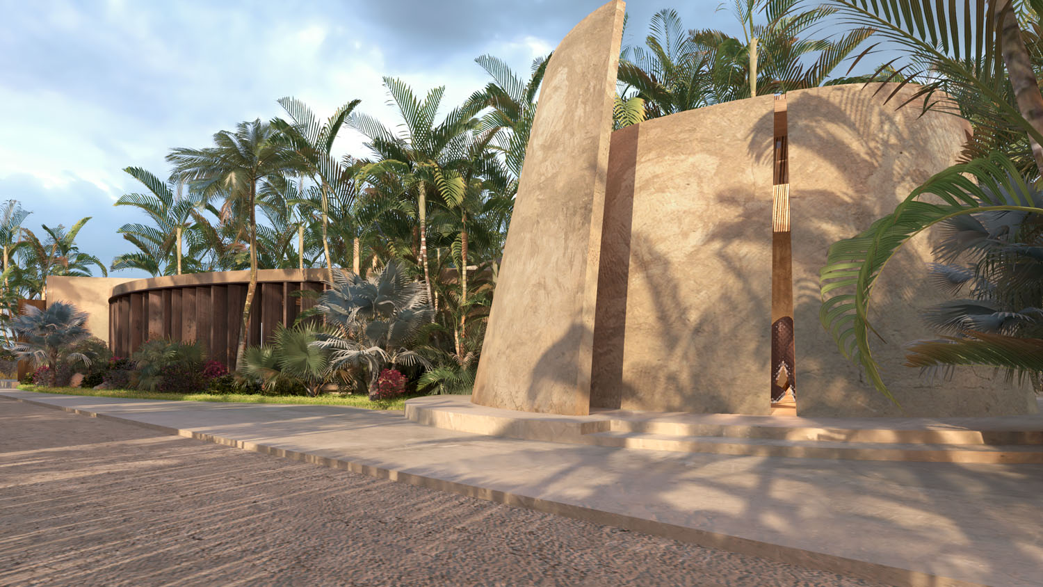 La icónica entrada al hotel es una escultura interactiva, busca resaltar el ritual que cada noche ofrece el cielo de Tulum y el diseño propuesto permite que el visitante se vuelva el principal protagonista y observador de este espectáculo natural.